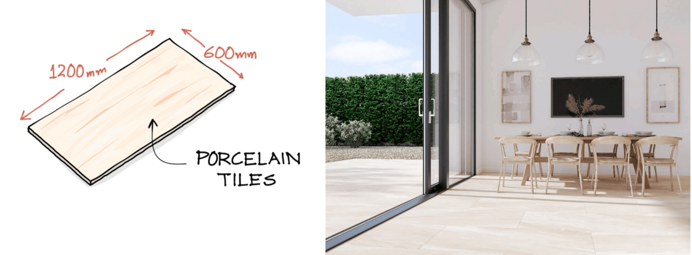 These tiles, typically measuring 600mm x 1200mm (24" x 48") or even larger at 900mm x 1800mm (36" x 72"), create a seamless transition that makes both spaces feel like one cohesive area.