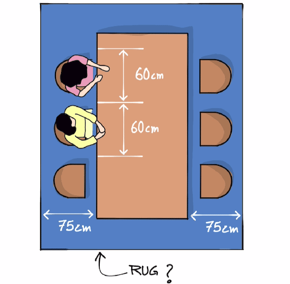 Your dining rug should extend 75cm (30 inches) beyond the table edge on all sides — this keeps chairs stable and prevents awkward edge folds.