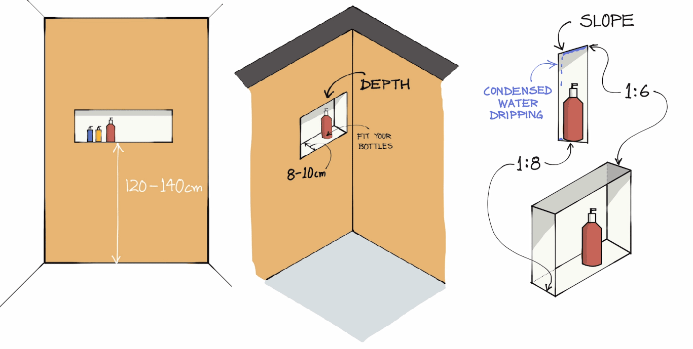 For steam showers, your niche top needs a 1:6 slope ratio to prevent condensation from dripping onto your products and creating that gross, slimy buildup.