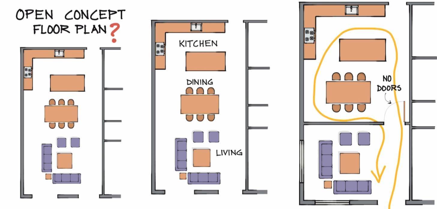 An Open Concept Floor Plan is when two or more functional spaces — typically the Kitchen, Dining, and Living areas — are merged into one large, continuous zone. The idea is to create a sense of togetherness while enhancing visual spaciousness.